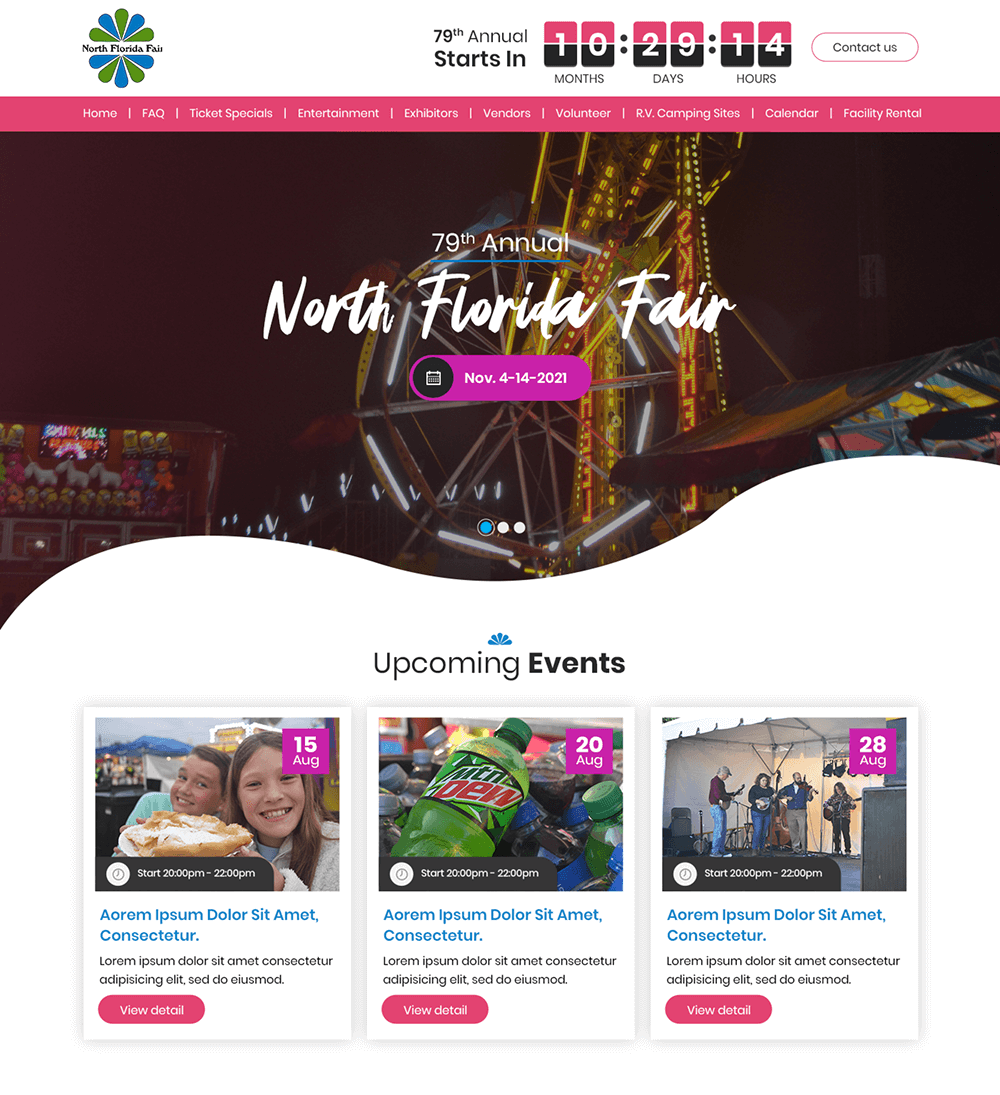 The North Florida Fair wanted to showcase upcoming events at the fairgrounds as well as keep information about the upcoming Fair updated. We provided them a way to feature new events on the homepage as well as a menu to easily navigate to the Fair information for tickets, specials, and acts.